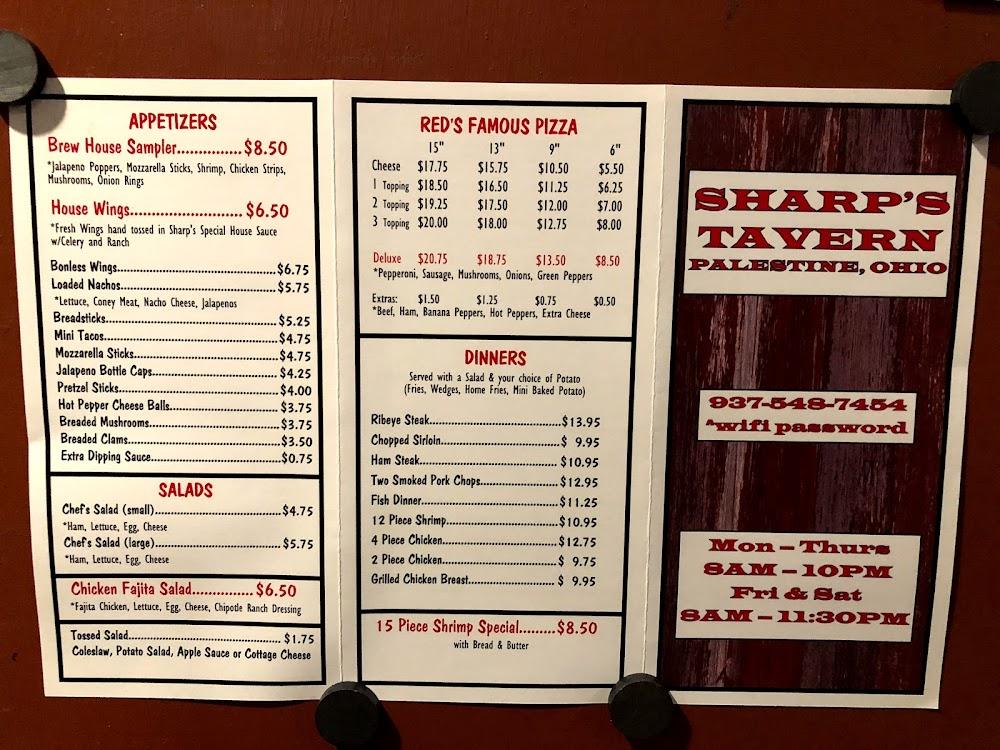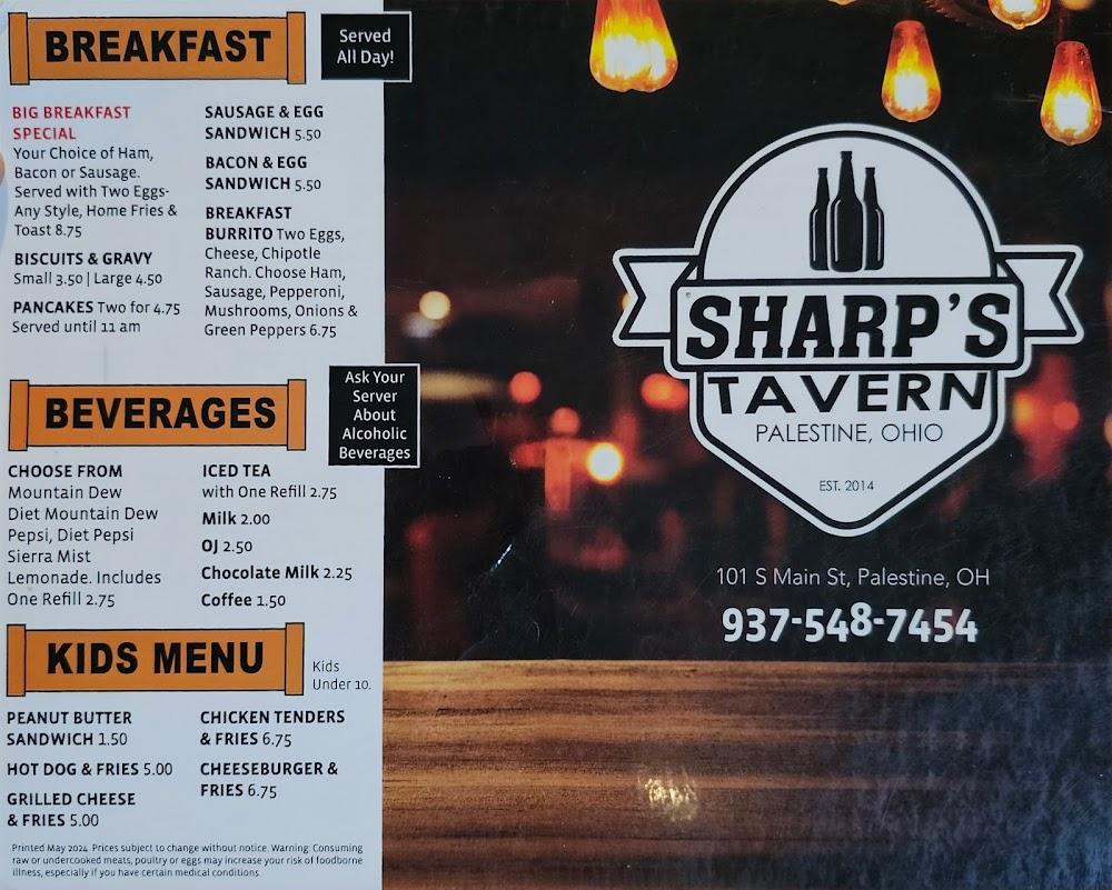 Welcome to Sharp's Tavern, your family-friendly dining destination located at 101 S Main St, Palestine, OH. We offer a diverse menu featuring delicious pizzas, local specialties, and a wide selection of cocktails and beers, all served in a relaxed atmosphere. Whether you choose to dine in or opt for carryout, our friendly staff is here to ensure a quick and enjoyable experience. With accessible seating and facilities, we welcome everyone, including families and groups. Join us for breakfast, lunch, or dinner and savor the flavors of home-cooked meals. Reservations are accepted, and we look forward to serving you soon!